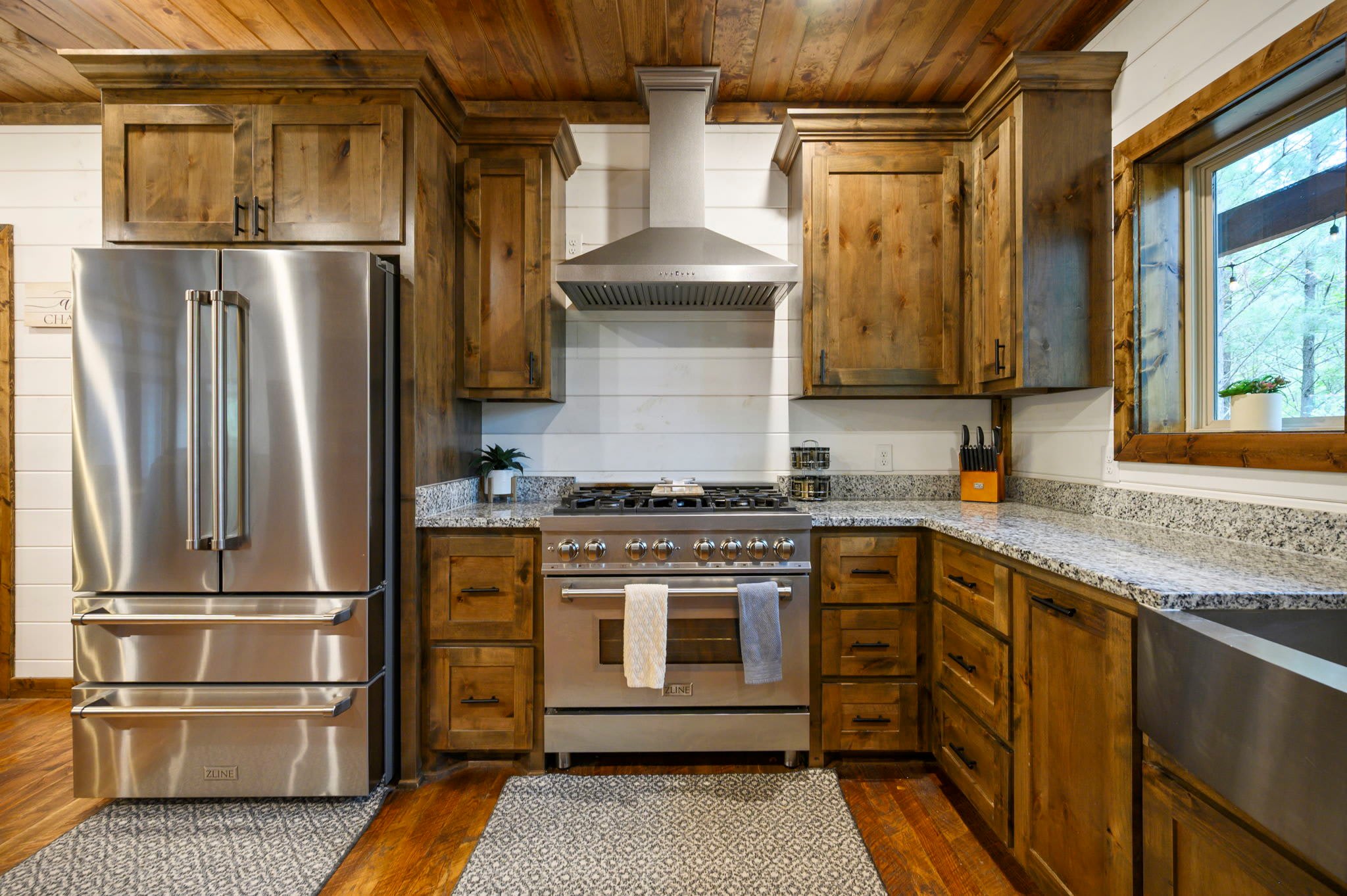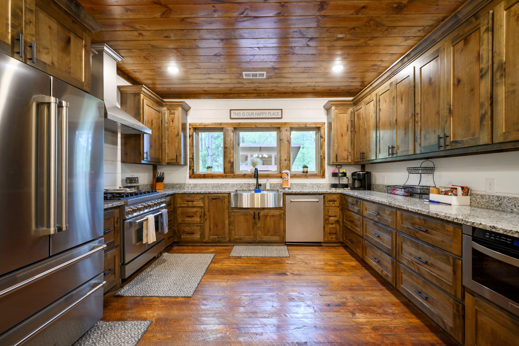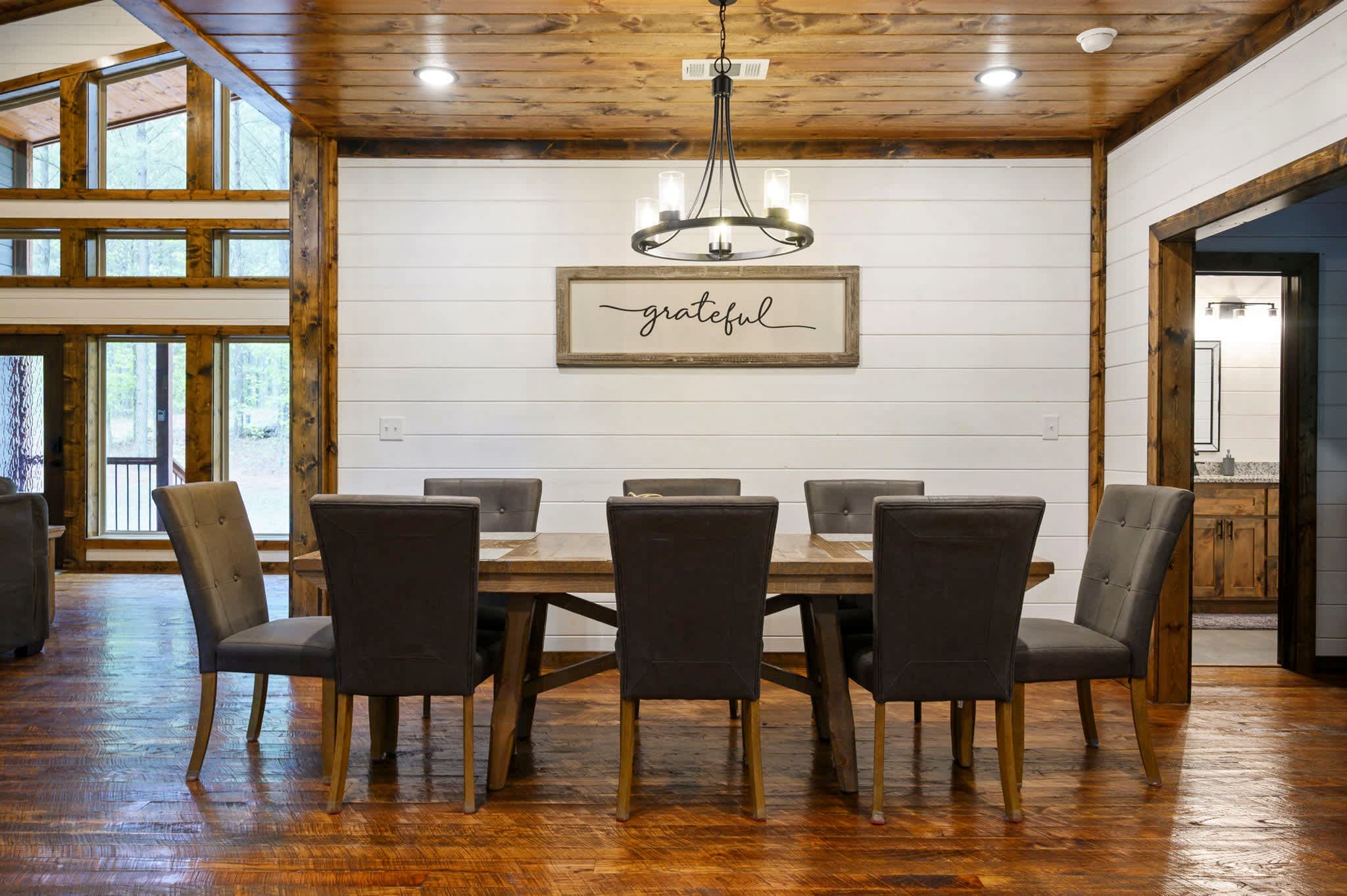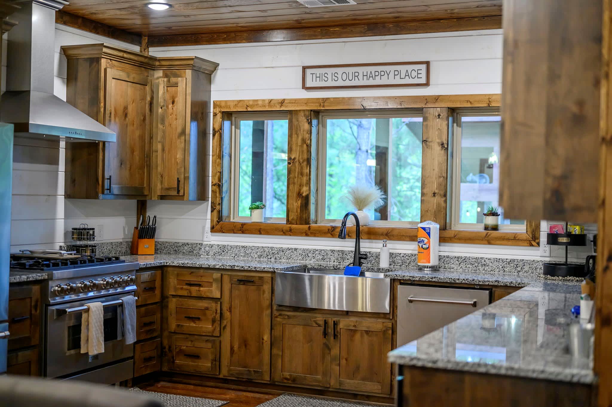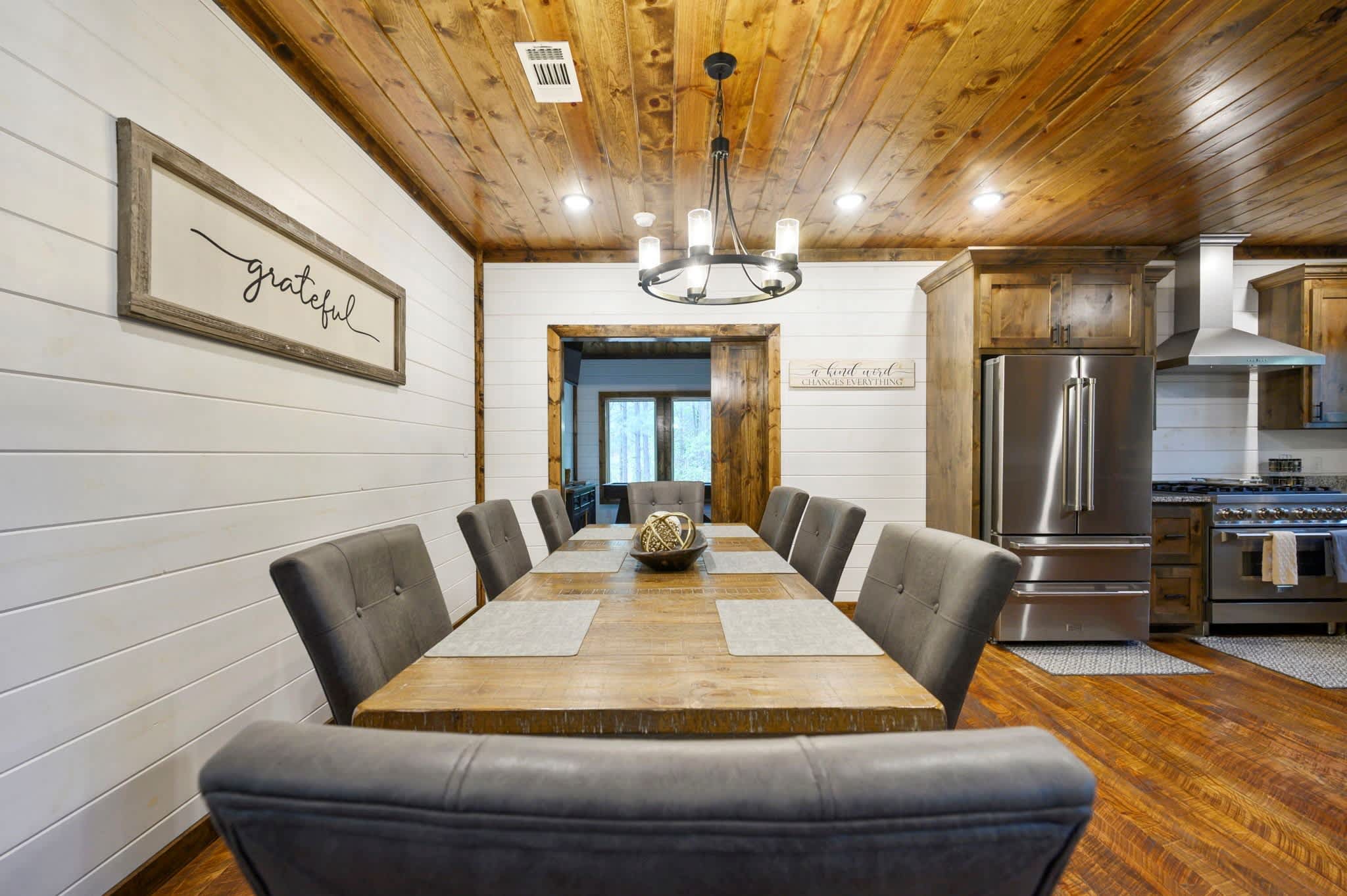 Inside, the warm and inviting living room showcases large windows, comfy leather furniture, a smart TV, and a gas fireplace that makes the space ideal for cozy nights in. The oversized kitchen is fully equipped with modern appliances, both Keurig and traditional coffee makers, and plenty of room for preparing meals for the whole group. Just beyond, the dining table for eight creates a natural gathering place for shared meals and conversation. Each bedroom features its own exterior door for added privacy and easy access to the outdoors, while the bunk room adds extra fun with a shuffleboard table. Thoughtfully designed and surrounded by trees, The Retreat at Red Fern is a relaxing and memorable Broken Bow getaway.