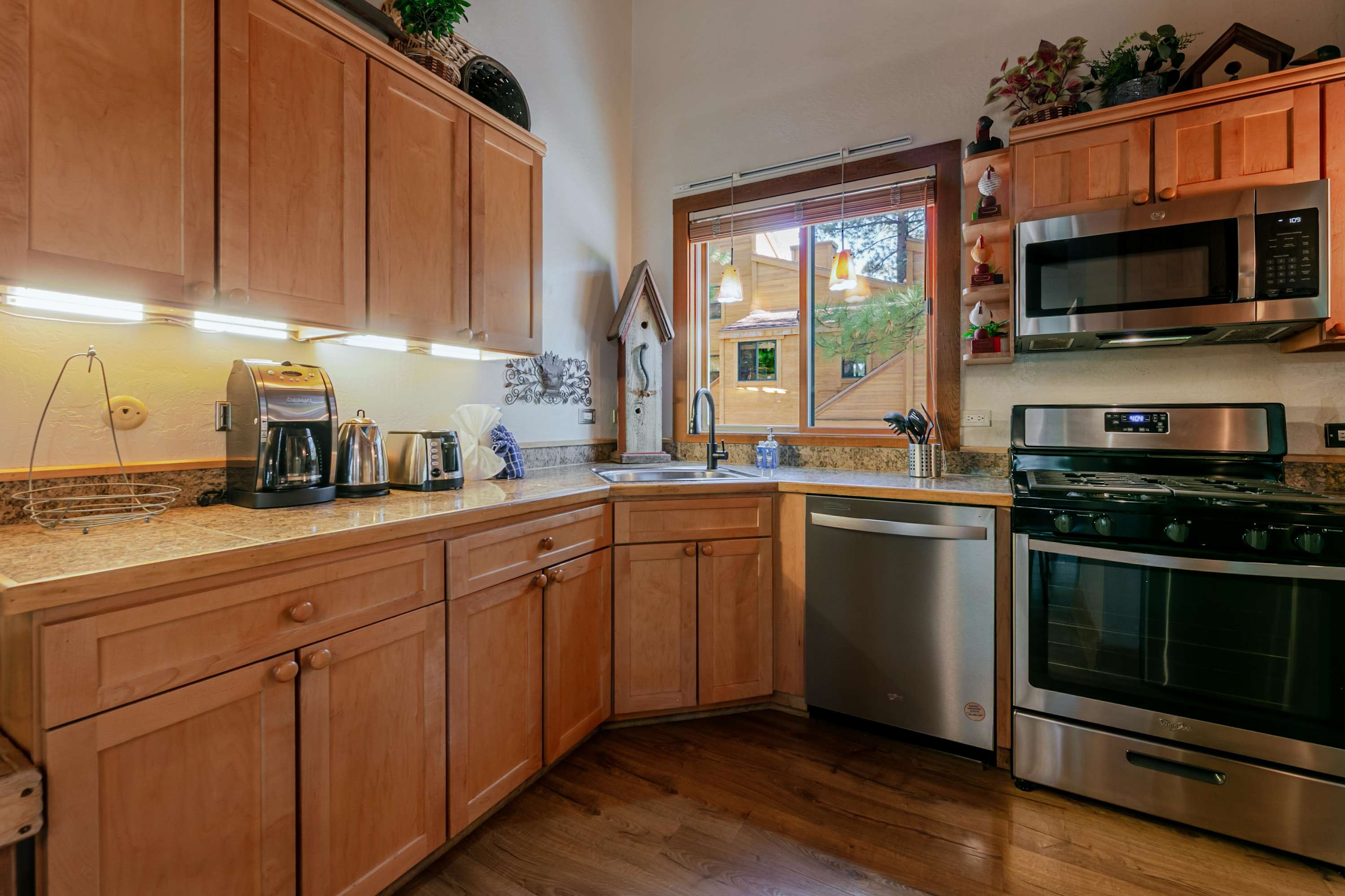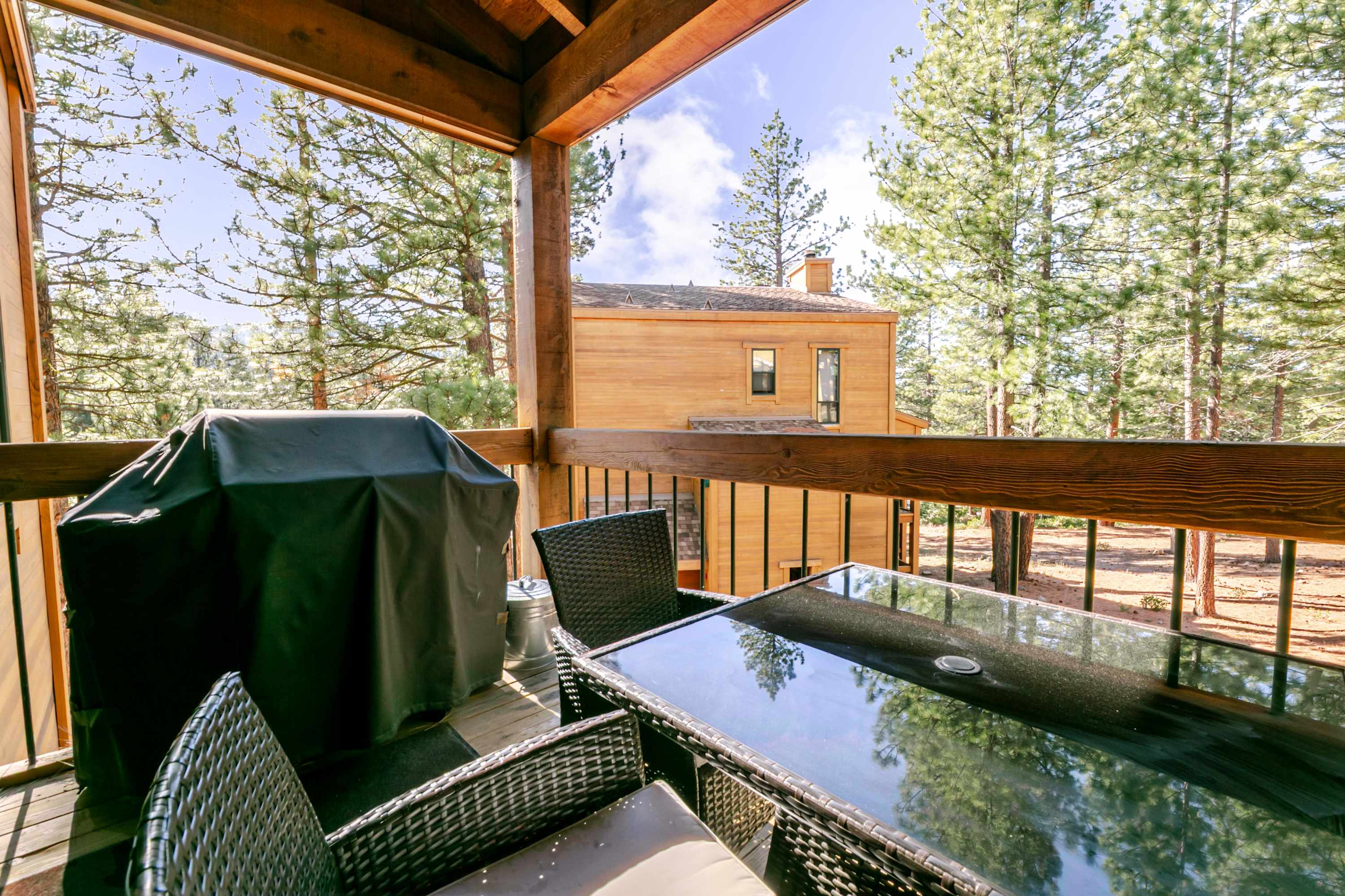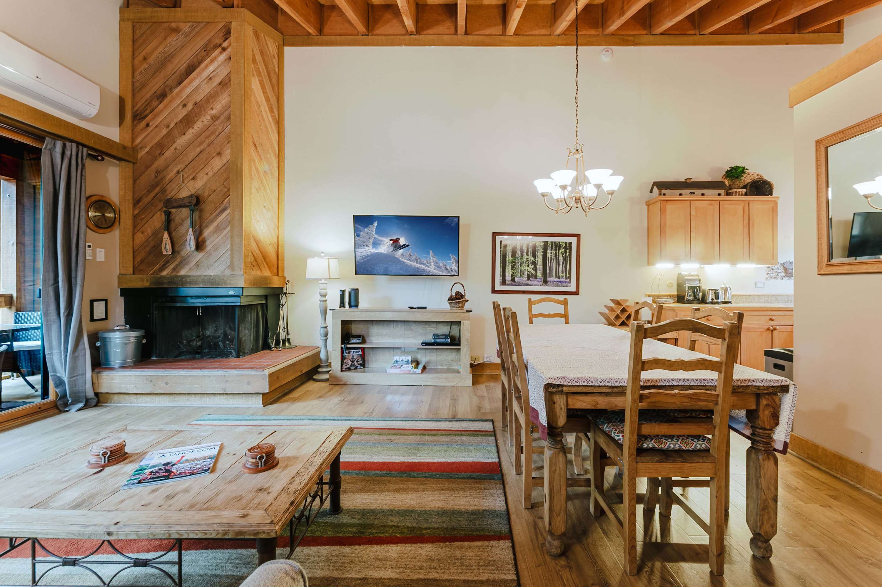Inside the condo, the kitchen invites relaxed mornings and shared meals with stainless steel appliances, Cuisinart and French press coffee options, and plenty of room for meal prep while chatting. A dining table for six flows into the comfortable living room, where a wraparound sectional faces a smart TV and a cozy wood-burning fireplace with gas assist. Sliding doors open to a balcony, while the lower covered deck features a grill and table for intimate al fresco meals surrounded by peaceful tree-lined views. Upstairs, one of the bedrooms adds a private balcony with a small table — perfect for quiet coffee or evening stargazing.