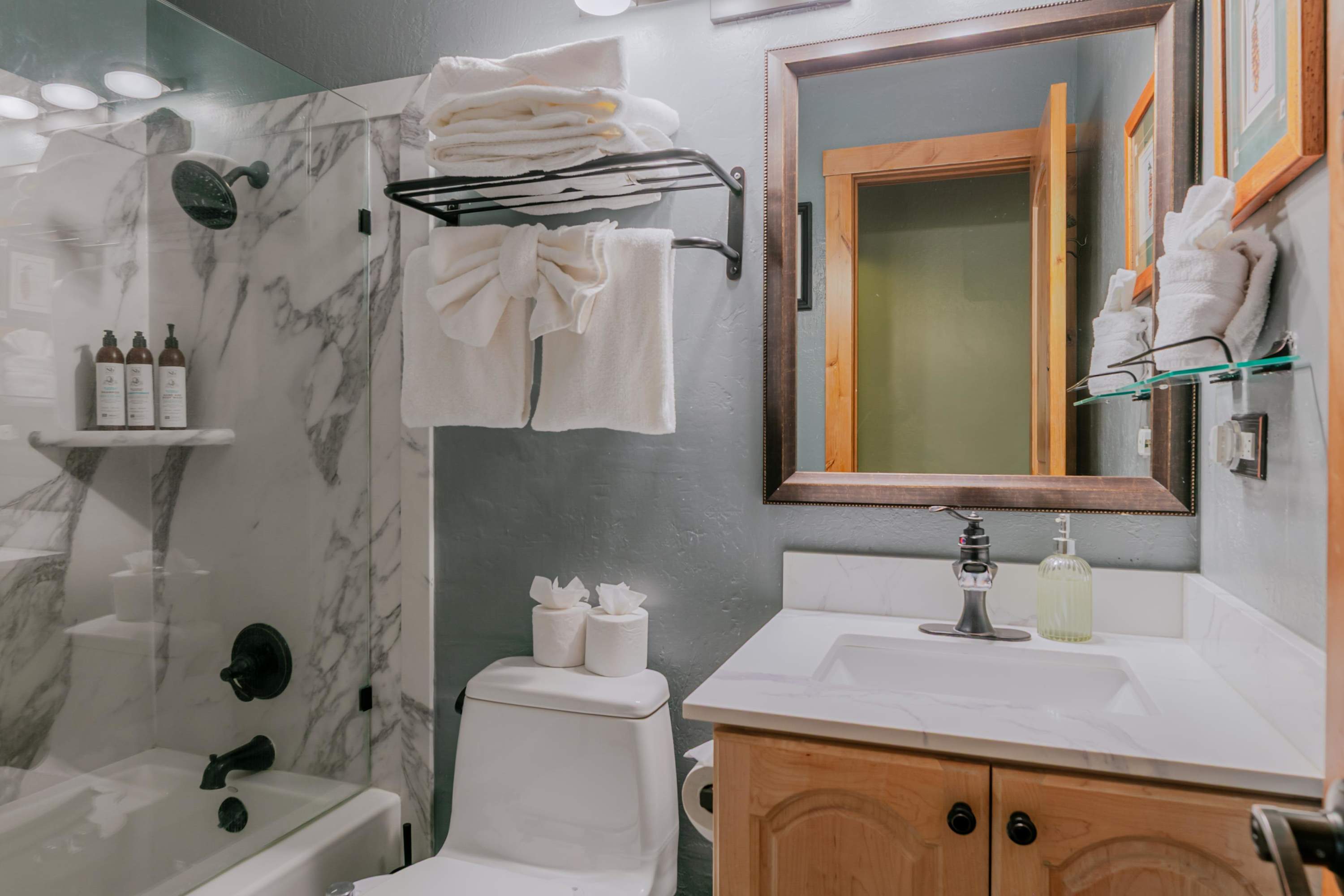 This home also includes a full guest bathroom with a single vanity and a shower/tub combo.