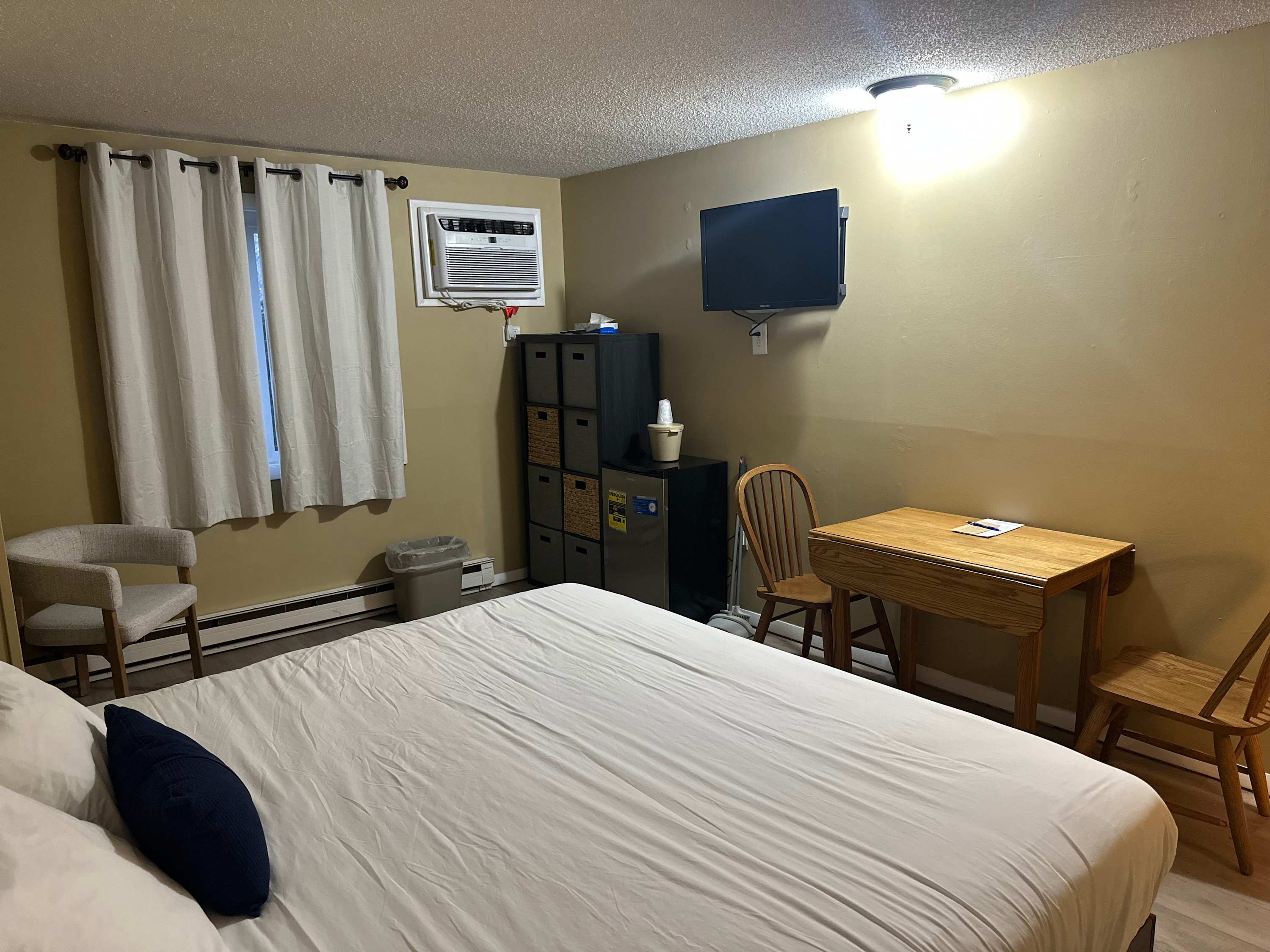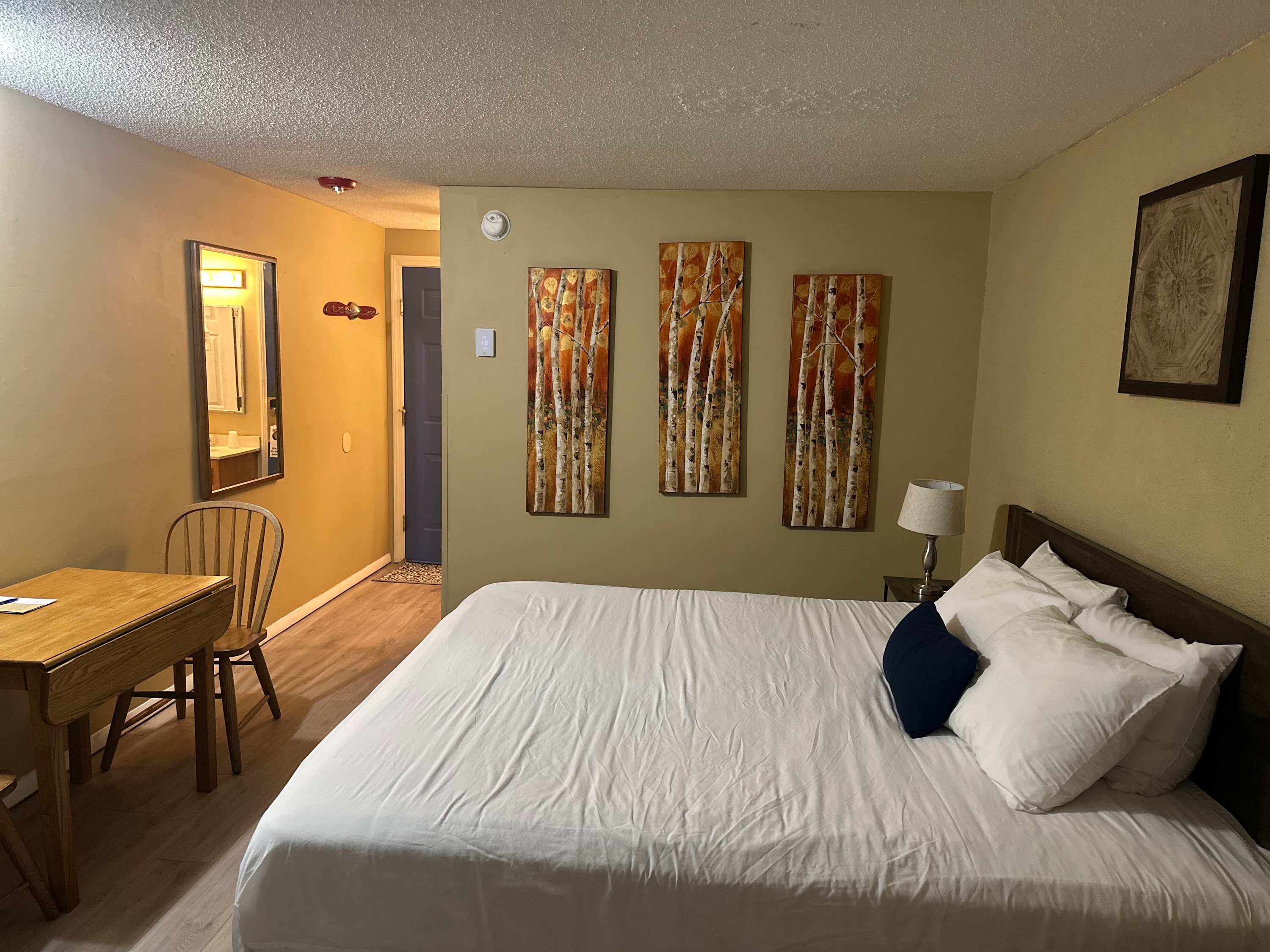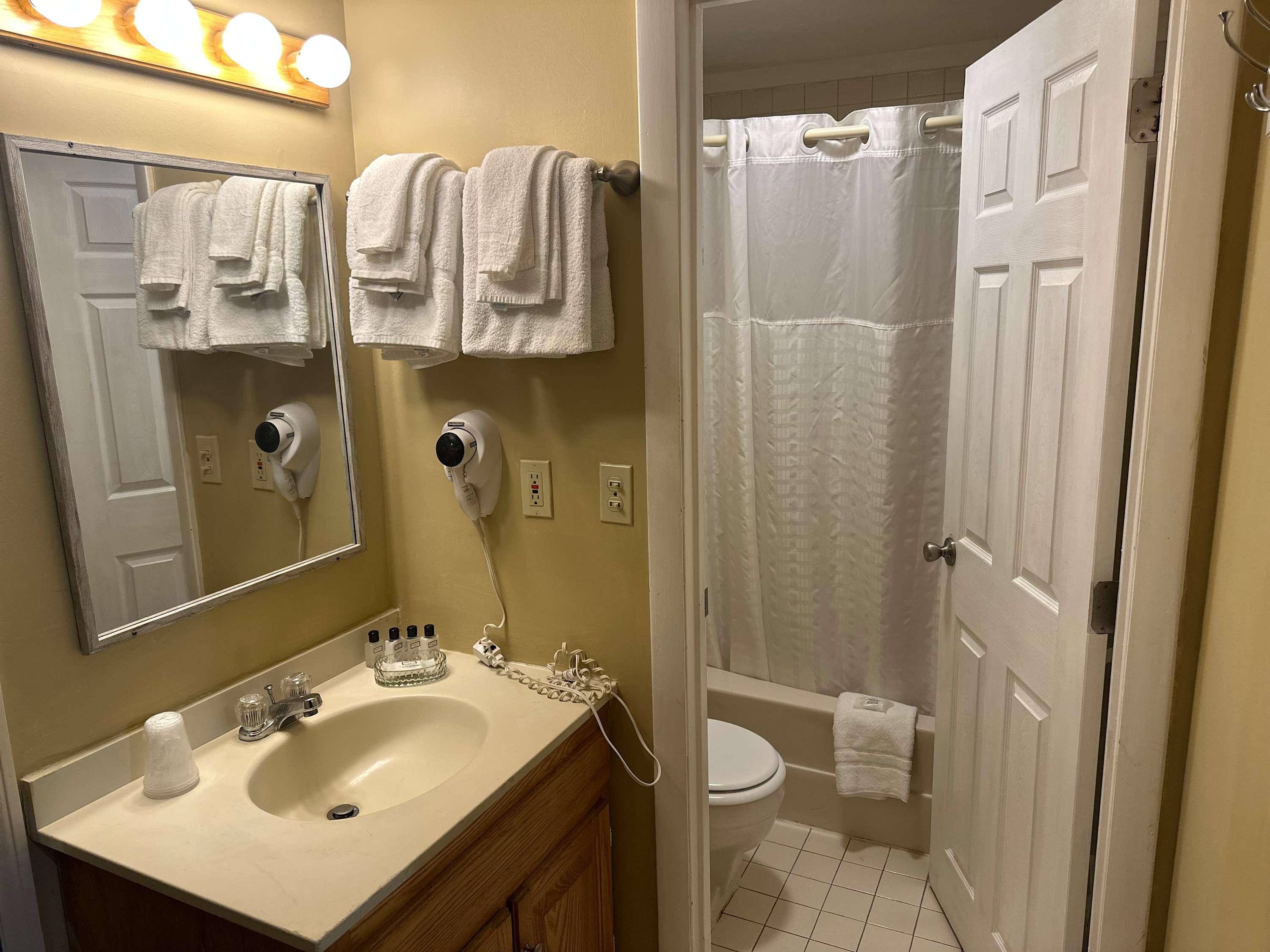 Inside, the suite features a comfortable, easygoing layout ideal for relaxing after a full day of exploring. A cable TV offers entertainment, while the convenient kitchenette includes a microwave and mini fridge for quick breakfasts, snacks, or late-night treats. A bistro-style table provides a cozy spot to enjoy meals, map out your plans, or check emails. The bathroom design places the vanity outside the shower area, creating extra space and added convenience when getting ready.
