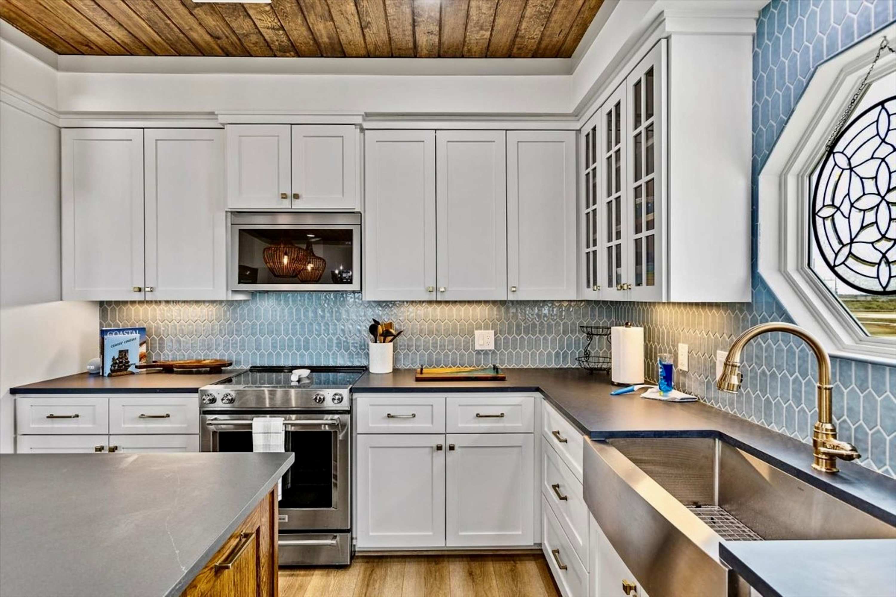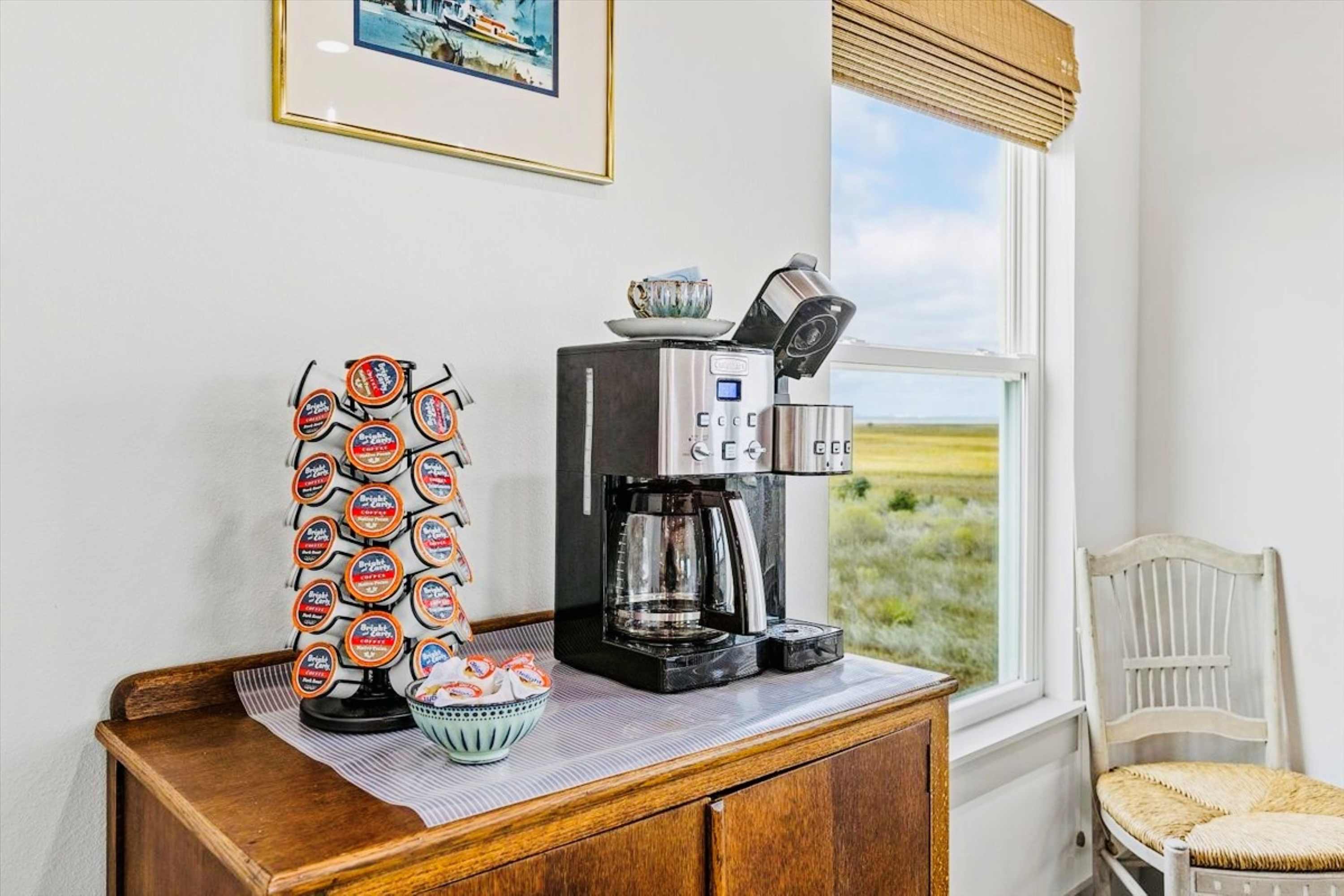 Inside, windows throughout the home frame the natural surroundings, filling the space with light and tranquil views. The open living area invites you to unwind with a comfortable couch, armchairs, smart TV, and board games ready for cozy evenings in. Just beyond, the kitchen overlooks the water and surrounding landscape, featuring stainless steel appliances, a fully equipped layout, and a dedicated coffee station with both single-cup and drip options. An island with seating for four flows easily into the dining table for six, creating a welcoming space for meals, conversation, and planning the day’s adventures.