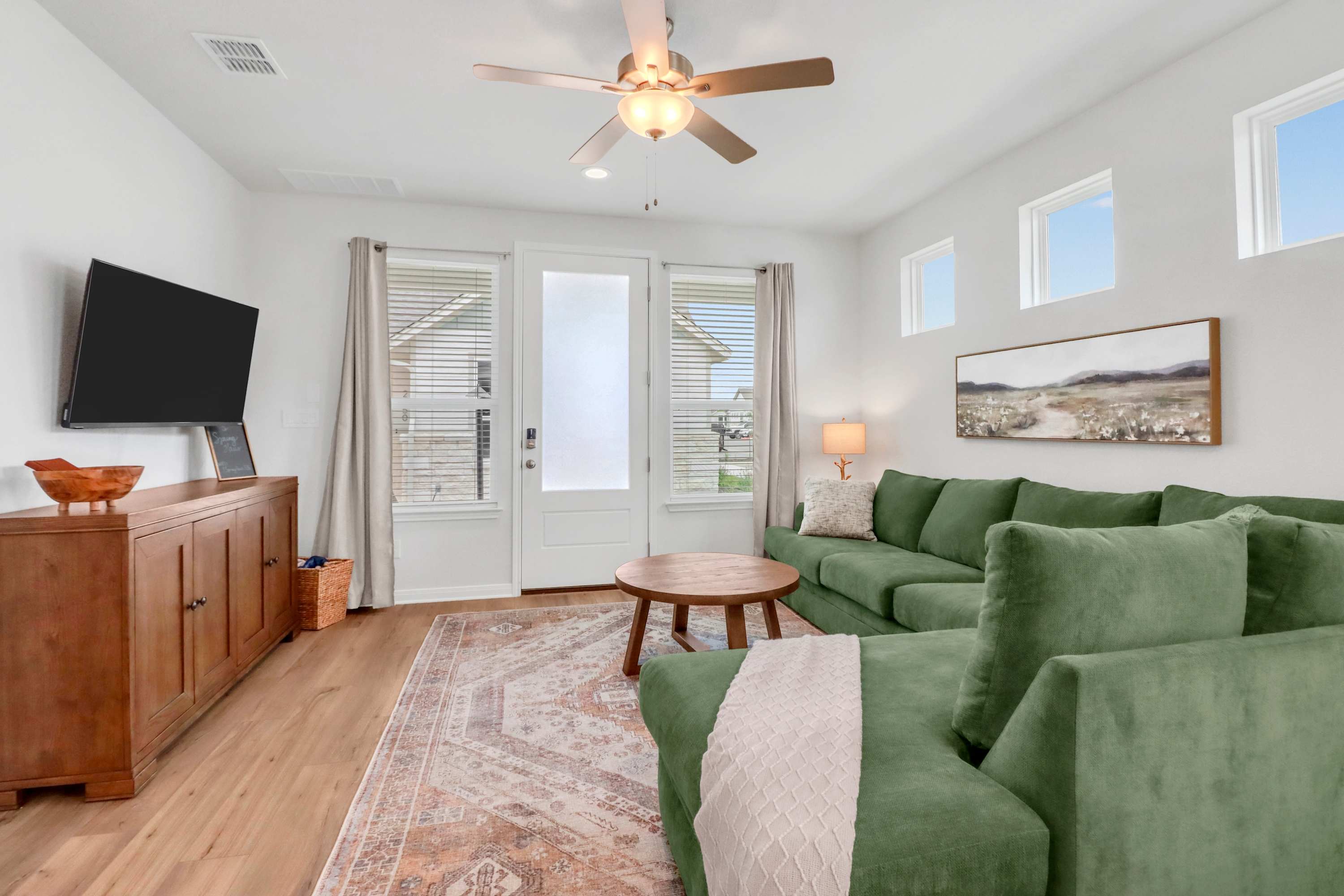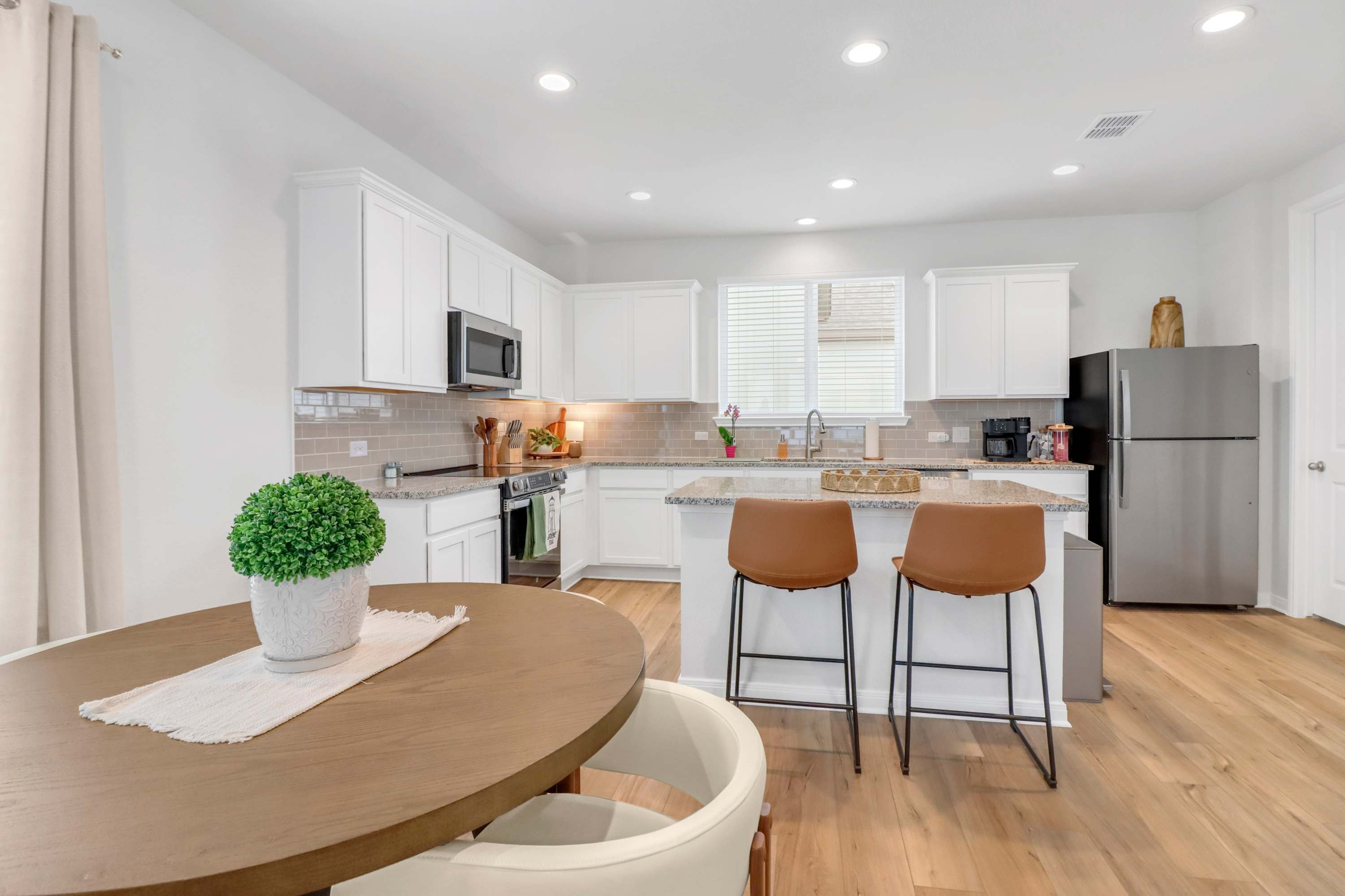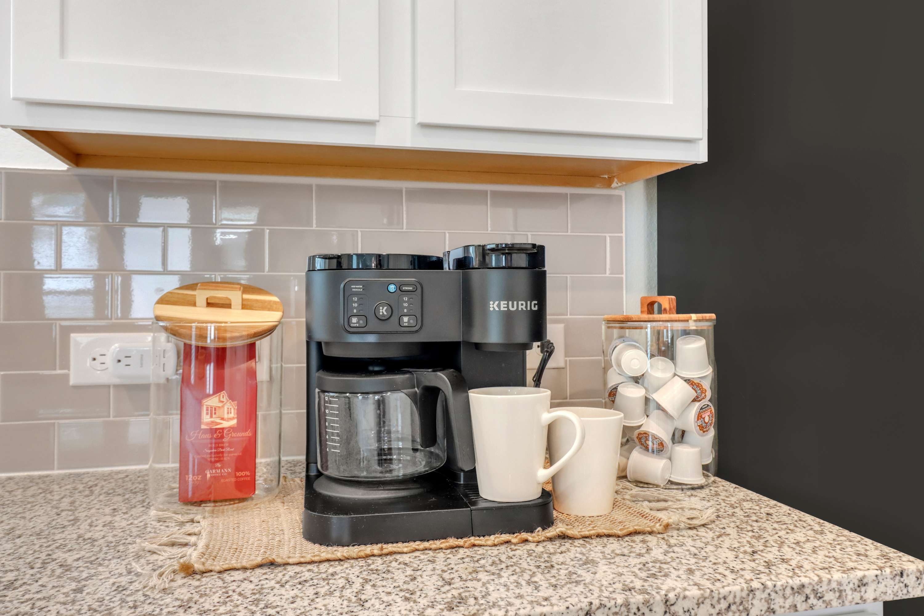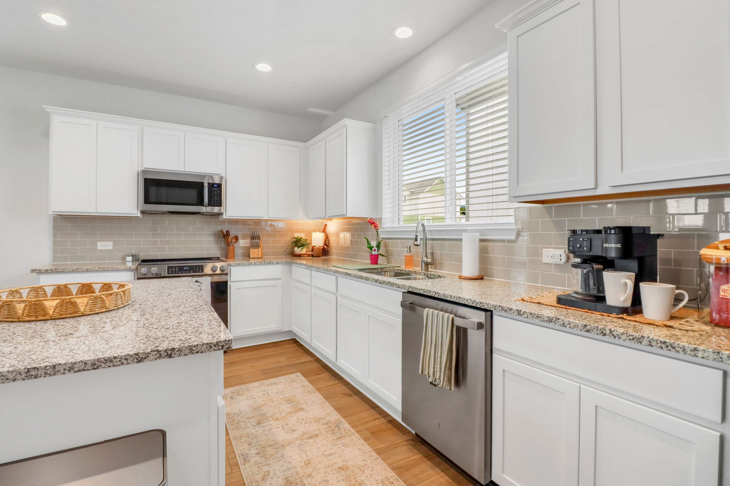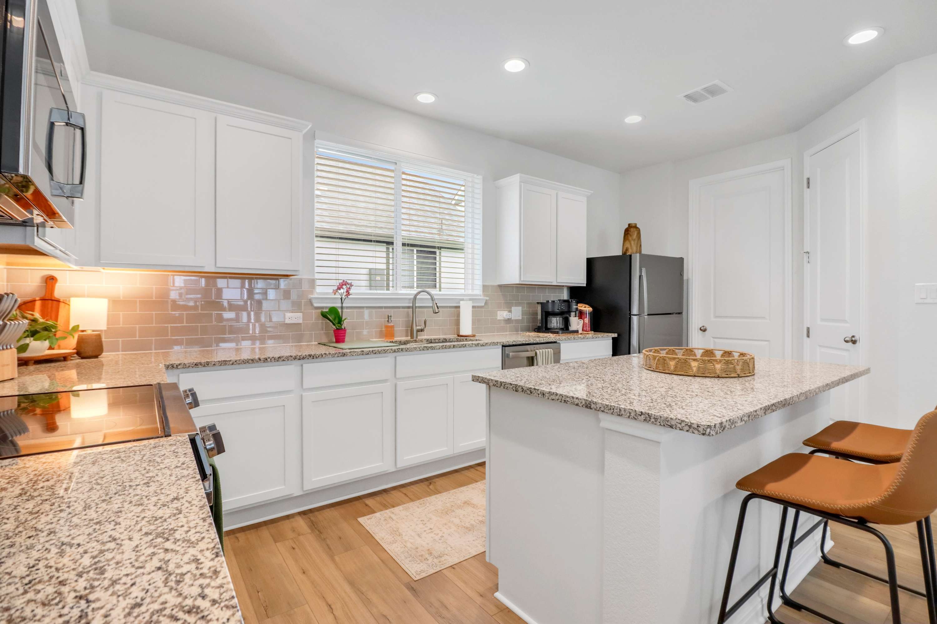 Inside, the open-concept living space welcomes you with a relaxed, modern feel. The living room features a cozy green L-shaped sofa perfectly positioned for movie nights on the smart TV, flowing seamlessly into the kitchen and dining area. The kitchen offers granite countertops, stainless steel appliances, a small island with two barstools, and a convenient combo drip and single-serve coffee maker for easy mornings. Just beside it, a dining table for four creates an inviting spot for meals, card games, or planning the day’s adventures in this charming Hill Country retreat.