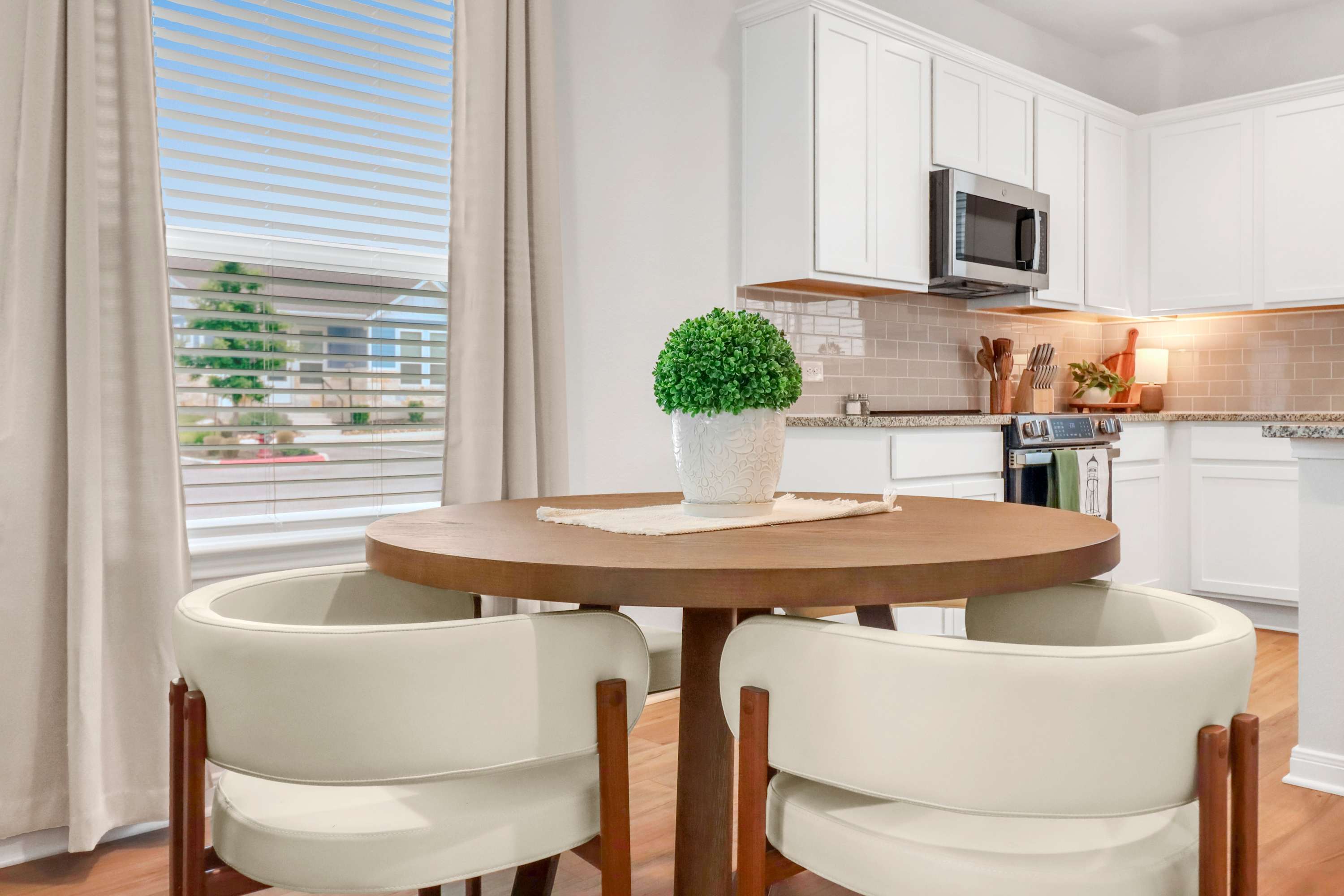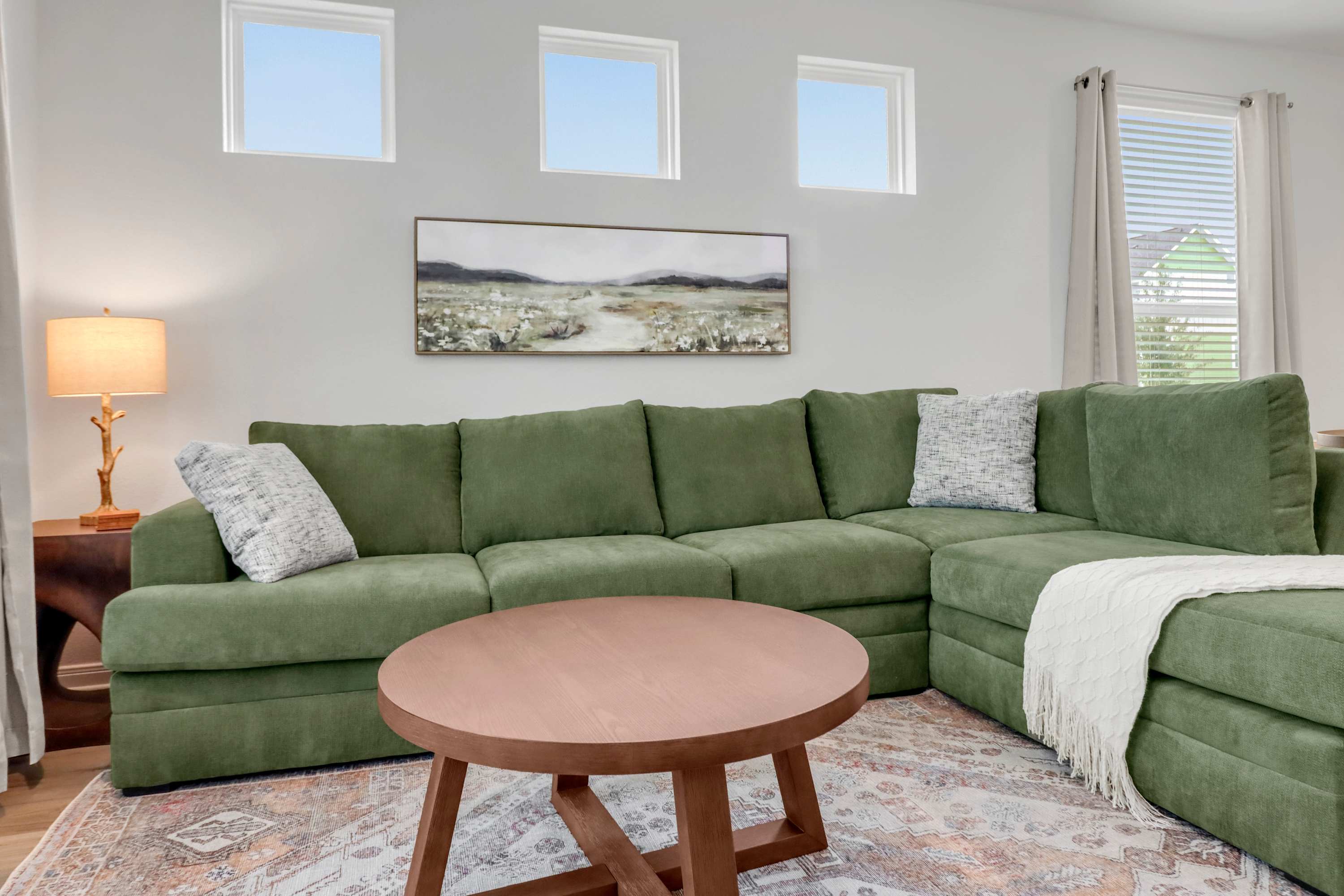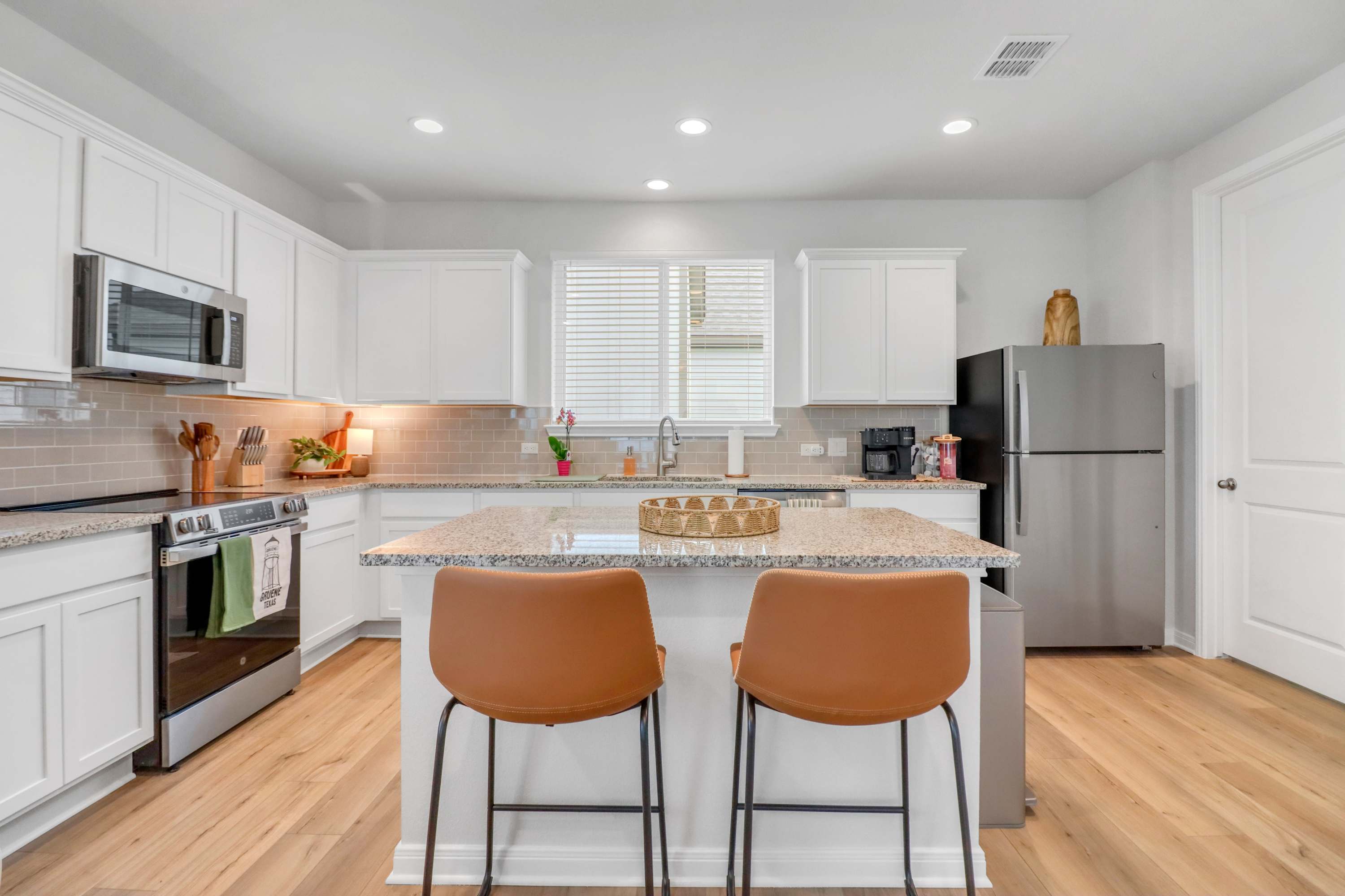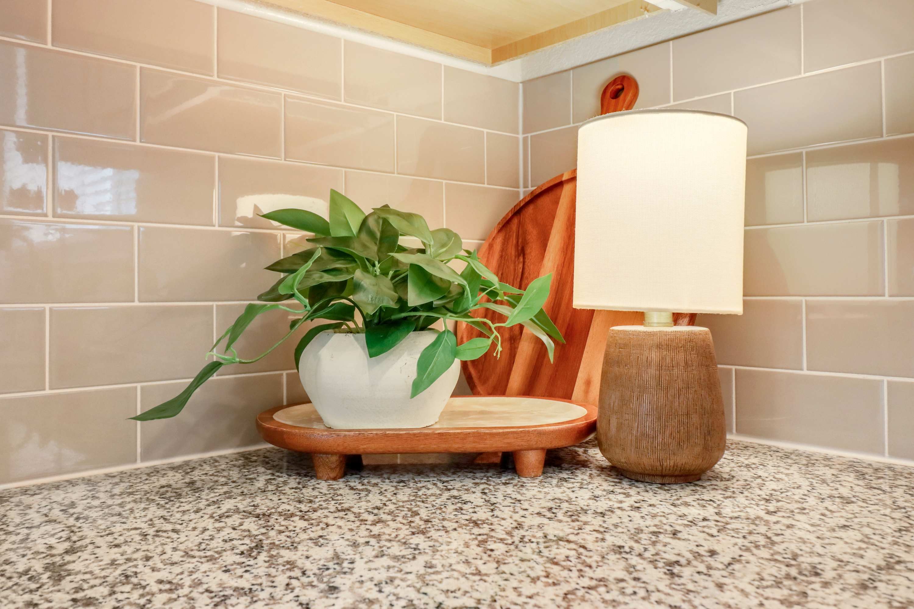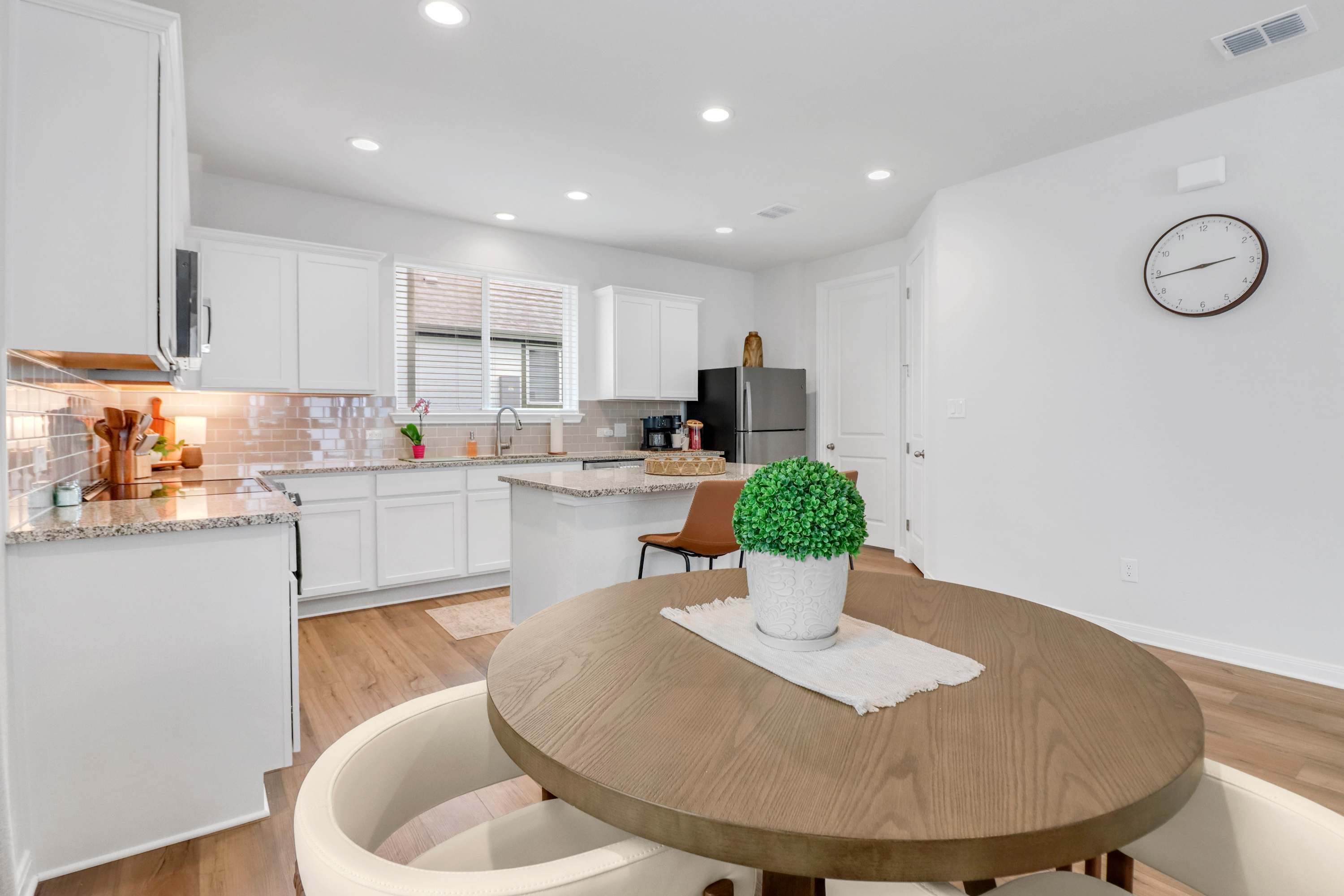 Inside, the open-concept living space welcomes you with a relaxed, modern feel. The living room features a cozy green L-shaped sofa perfectly positioned for movie nights on the smart TV, flowing seamlessly into the kitchen and dining area. The kitchen offers granite countertops, stainless steel appliances, a small island with two barstools, and a convenient combo drip and single-serve coffee maker for easy mornings. Just beside it, a dining table for four creates an inviting spot for meals, card games, or planning the day’s adventures in this charming Hill Country retreat.